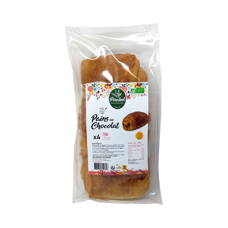 Farine de blé* T55, beurre 18,2%, eau filtrée, chocolat* (sucre de canne* blond, cacao*, beurre de cacao*, extrait naturel de vanille*), sucre de canne* blond, levure* boulangère, sel de Guérande. Dorure à l'uf*. * issus de l'agriculture biologique