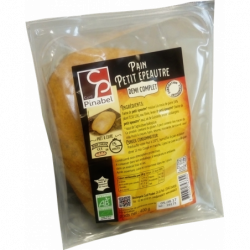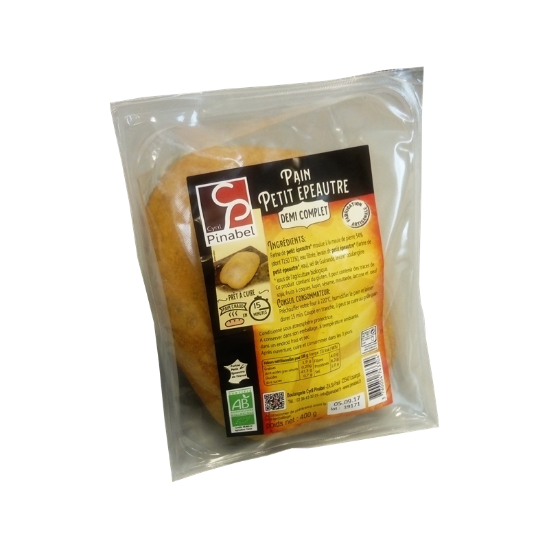 Farine de petit épeautre* moulue à la meule de pierre 54% (dont T150 11%), eau filtrée, levain naturel* (farine de petit épeautre*, eau), sel de Guérande, levure* boulangère.