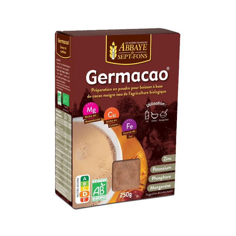 *sucre roux; *cacao fortement dégraissé en poudre(30%); *céréales complètes (soja²; orge; avoine, seigle; riz; sarrasin; blé 1%); *caroube; extrait *vanille Bourbon Madagascar; algues marines Laminaria digitata.