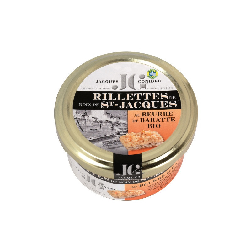 Noix de Saint Jacques 31% (**espèce et origine : voir sur le couvercle), poissons blancs (chair et pulpe), crème fraîche*, carottes*, beurre* de baratte demi-sel 4,7%, huile de tournesol*, oignons* réhydratés, sel, stabilisants : gommes de guar* et de caroube*, épices*.