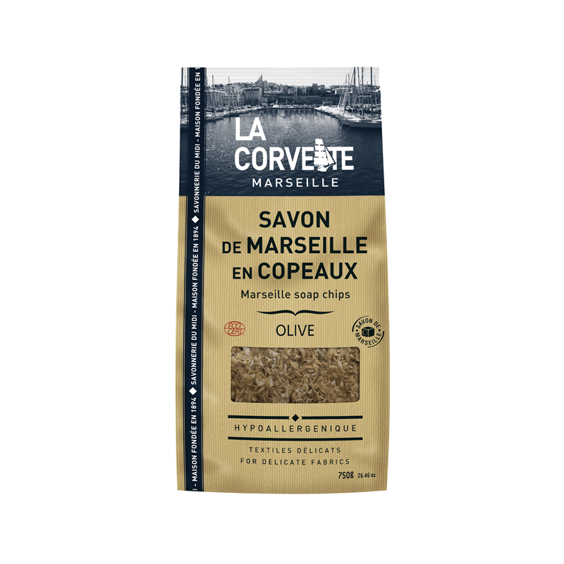 Les copeaux de Savon de Marseille La Corvette sont fabriqués à partir d'huiles 100% d'origine végétale à Marseille, selon le procédé traditionnel de cuisson au chaudron. Ces copeaux