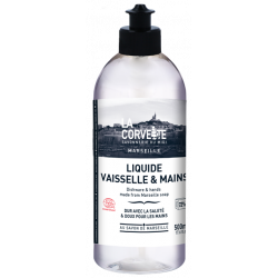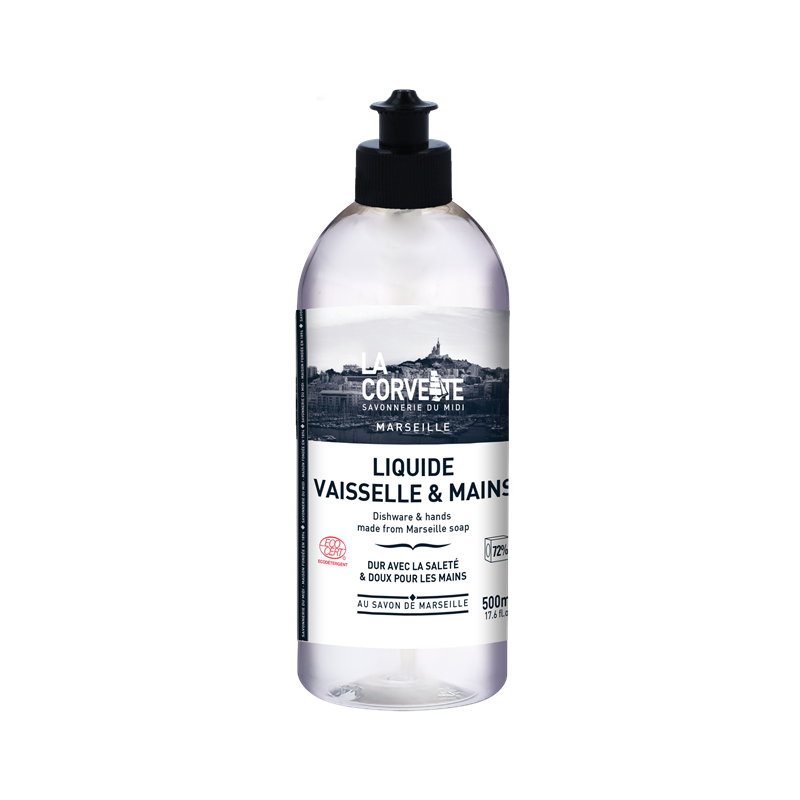 Liquide Vaisselle et Mains Formulé à Base de Véritable Savon de Marseille Cuit au Chaudron Selon un Procédé de Fabrication Traditionnel.