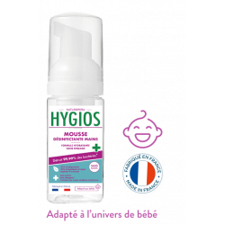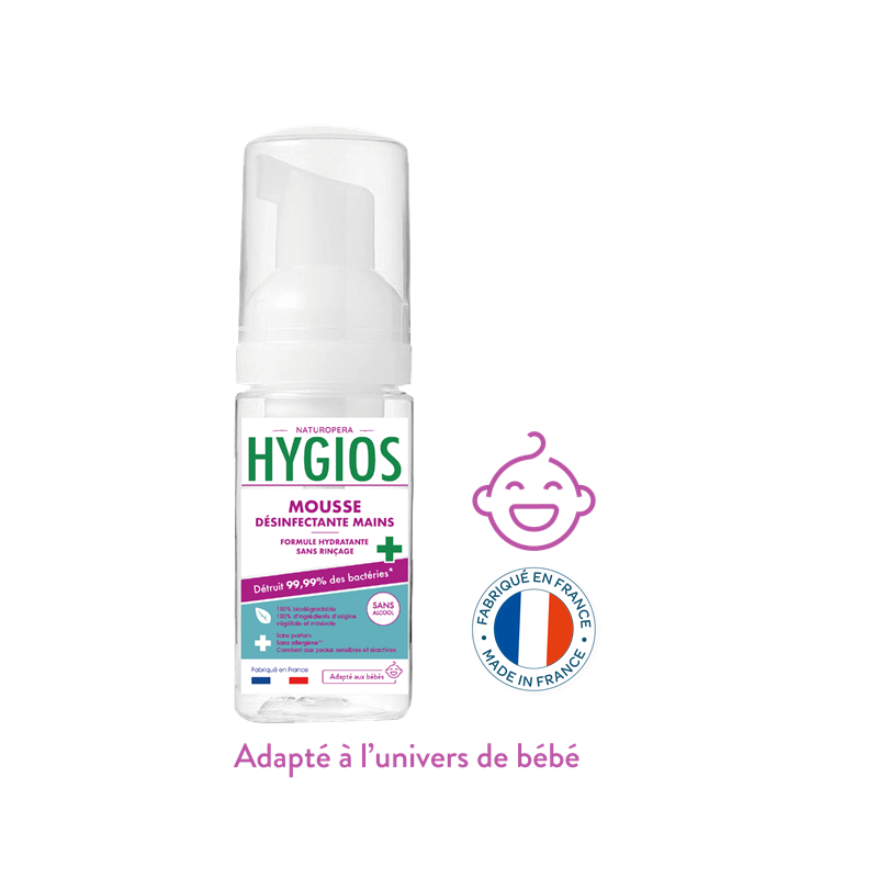 *Activité bactéricide, levuricide et virucide (uniquement contre virus enveloppés). TP1/AL: 20°C (30sec), EN13727, EN1500, EN1276, EN13624, EN1650, EN14476+A1. Mousse désinfectante Hygios 100% végétale et naturelle, une alternative au gel hydroalcoolique.