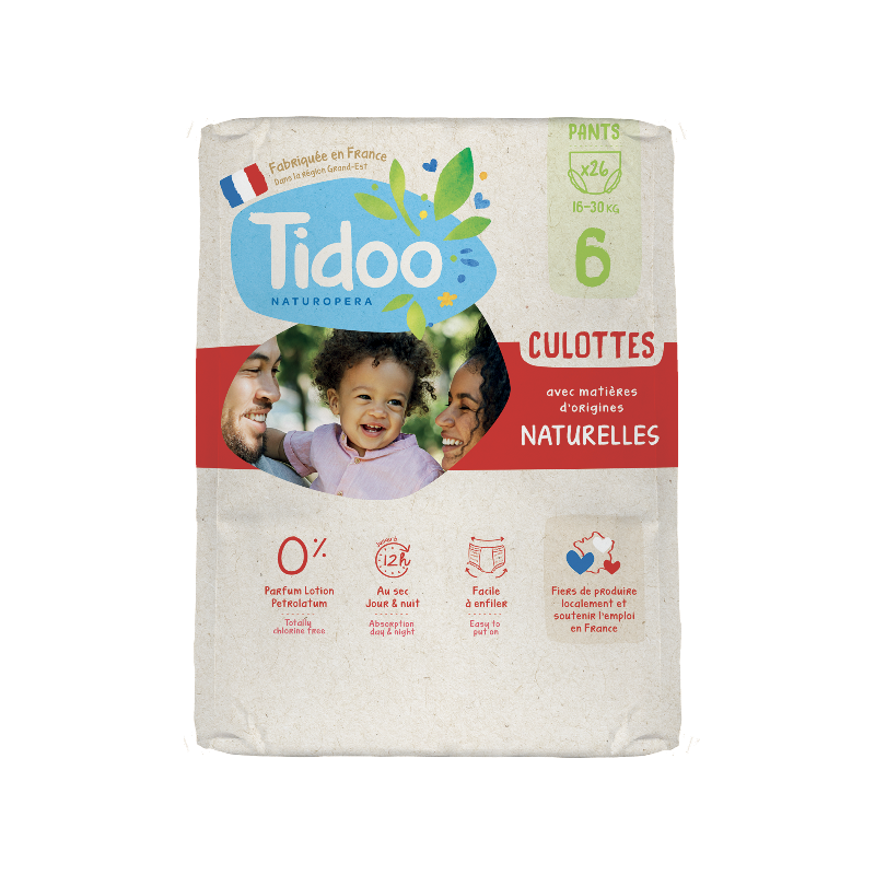 1) Cœur absorbant : cellulose naturelle de bois (blanchie sans chlore) issue de forêts gérées de façon responsable certifiée FSC et d’autres sources contrôlées et microbilles absorbantes (polyacrylate de sodium) enveloppées dans un voile de maintien en polypropylène et recouvert d’un voile d’acquisition en polyester. 2) Voile de surface sans lotion, sans pétrolatum, sans parfum : tissu non tissé hydrophile BioPE/PP (canne à sucre et polypropylène). 3) Barrières anti-fuites : tissu non tissé BioPE/PP (canne à sucre et polypropylène), élastique barrière sans latex. 4) Ceinture élastique : textile doux avec élastiques sans latex. 5) Voile extérieur respirant : non tissé PP et film PE imprimé, décors : encre à l’eau sans solvant. 6) Languette de fermeture : pour jeter dans la poubelle la culotte usagée en toute sérénité.