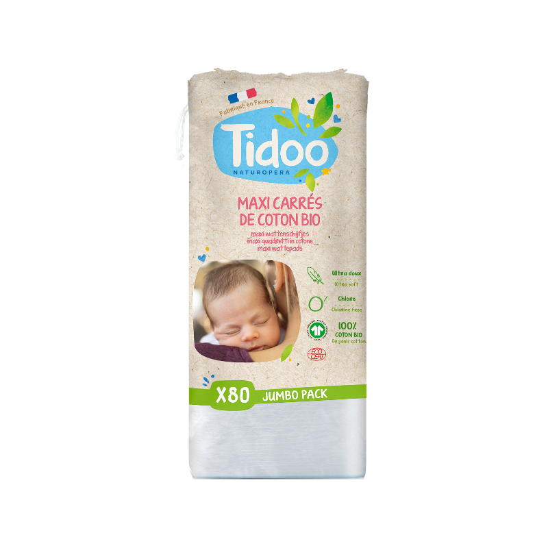 Faciles à utiliser grâce à leur grande taille, les Maxi carrés de coton ultra doux. Tidoo Care s'adaptent parfaitement à la toilette de bébé comme aUx soins de la peau. Résistants, ils ne peluchent pas et ne se dédoublent pas. Pour plus de pureté et de douceur, les Maxi carrés de coton ultra doux Tidoo Care sont composés à 100% de coton biologique, cultivé sans pesticides et blanchi à l'eau oxygénée. Ne contient pas de chlore. Fabriqué en France