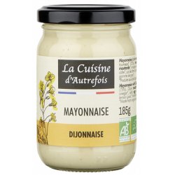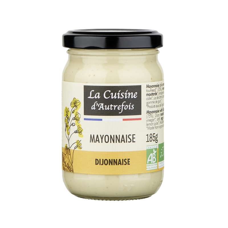 Huile de tournesol désodorisée* 75 %, moutarde de Dijon* 9 % (eau, graines de moutarde*, vinaigre de cidre*, sel), jaune d'oeuf* (jaune d'uf*, sel), eau, vinaigre de cidre*, jus de citron concentré*, épaississants : gomme de xanthane et gomme de guar*.