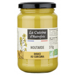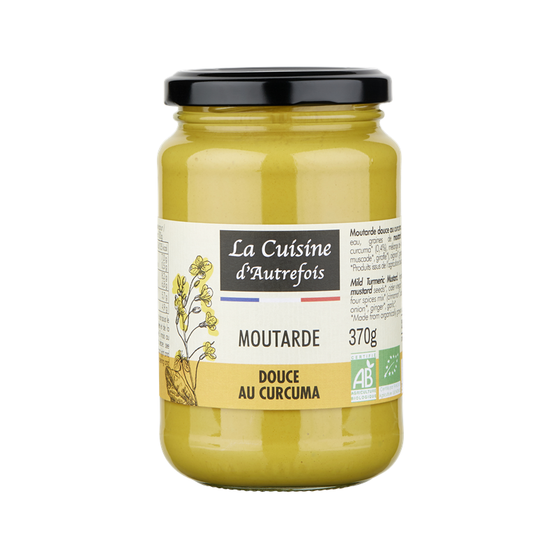 Eau, graines de moutarde*, vinaigre d'alcool*, vinaigre de cidre*, sucre*, sel, curcuma en poudre* 0,4 %, mélange d'épices*, oignon déshydraté*, gingembre en poudre*, ail en poudre*.