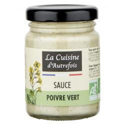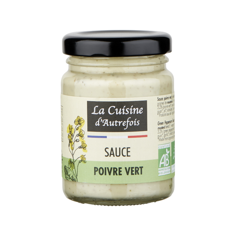 Huile de tournesol désodorisée*, eau, moutarde de Dijon* (eau, graines de moutarde*, vinaigre de cidre*, sel), jaune d'uf pasteurisé*, vinaigre de cidre*, poivre vert en saumure* 2,2 % (poivre vert*, eau, sel, vinaigre*), sel, ail en poudre*, échalotes déshydratées*, poivre vert* 0,3 %, poivre blanc*, huile essentielle de poivre noir (Piper nigrum L.)*, épaississants : gomme de xanthane et gomme de guar*.