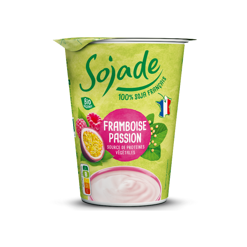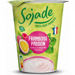 Jus de soja* 78% (eau, graines de soja* 10,8%), sucre de canne non raffiné*, framboise* 7%, jus de fruit de la passion* 2%, amidon de tapioca*, arôme