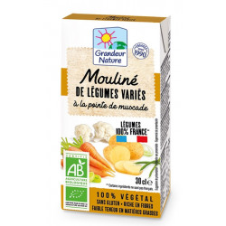 Légumes*55% (carottes*(17.6%),pommes de terre*(17.6%),céleri rave*,oignons*(4.9%),choux fleurs*(4.9%),poireaux*(3.3%),haricots verts*(1.1%)),eau,huile d'olive vierge extra*,sel,ail*,livèche en poudre*,thym*,marjolaine en poudre*,poivre*,muscade*(0.006%)* Produit issu de l'agriculture biologique