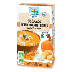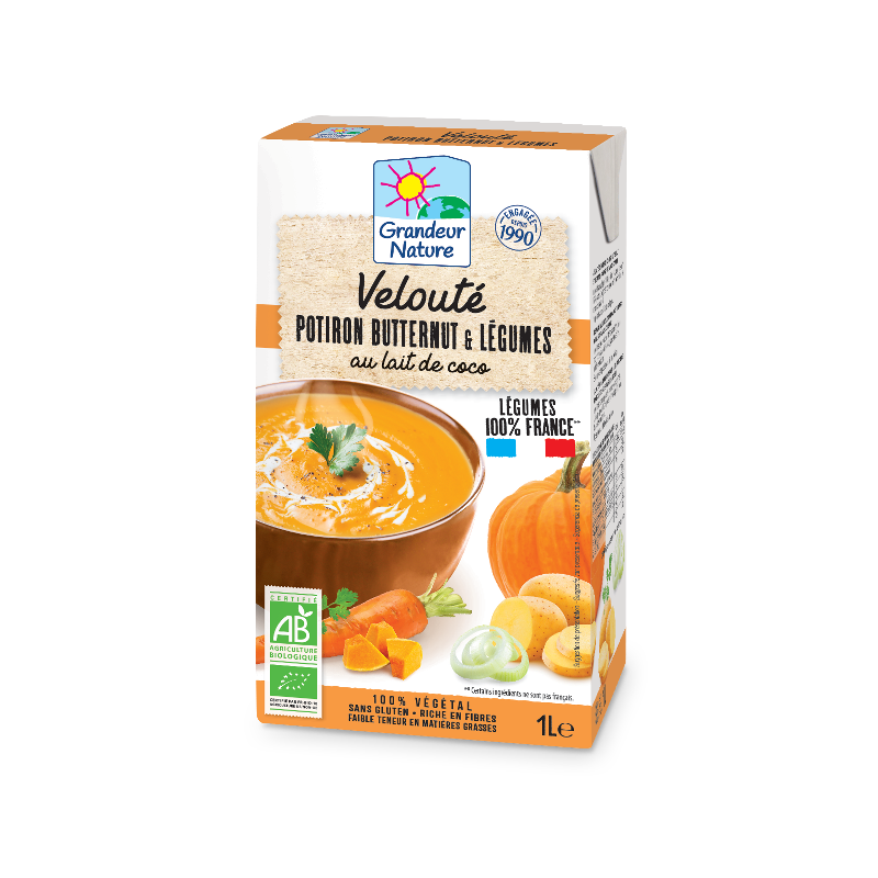 Légumes* 48.5% (potiron* 17.9%, courge Butternut* 12,6%, carottes* 8.2%, oignons* 4.8%, pommes de terre* 4.8%), eau, amidon de maïs*, crème fraîche* 3%, sel.*Issu de lagriculture biologique