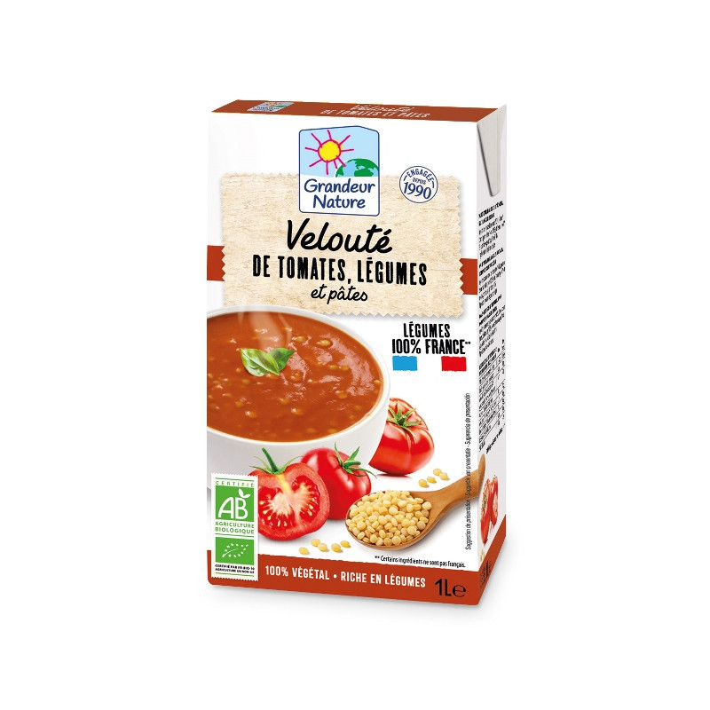Jus de tomate à base de concentré* 50,4%, eau, légumes* (carottes*, pommes de terre*, poireaux*), pâtes* (semoule de blé dure*) 2%, huile dolive vierge extra*, sel, ail*, basilic* *Ingrédients issus de l'agriculture biologique.