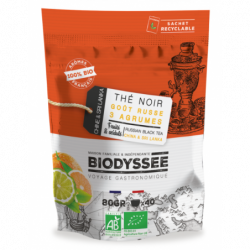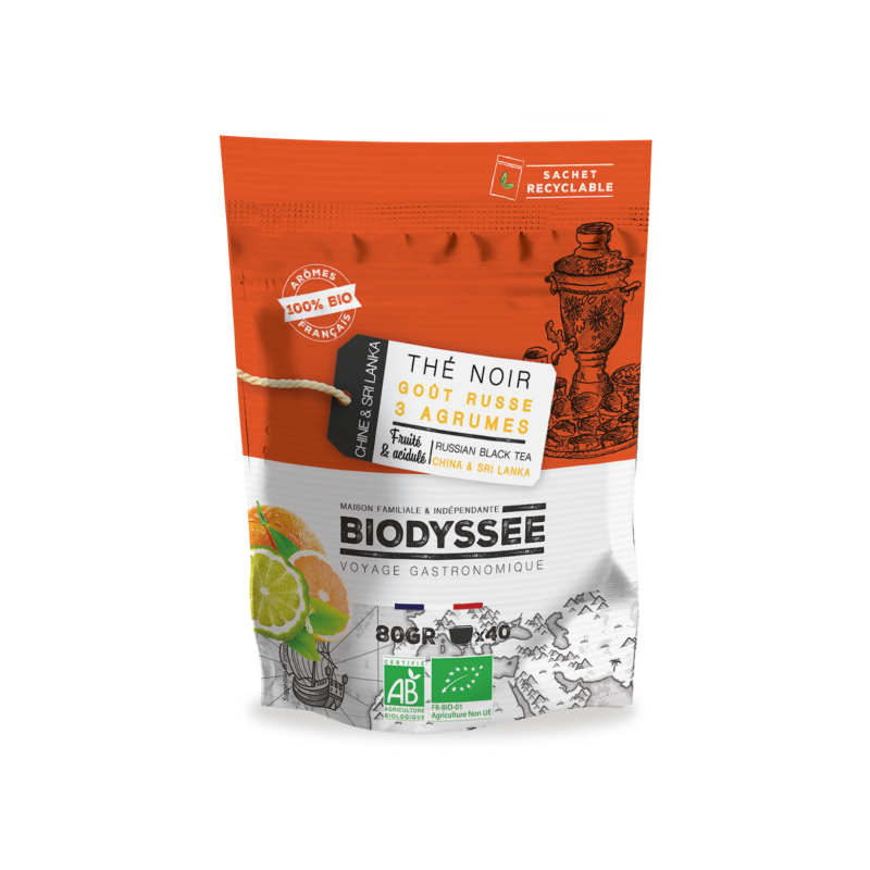 Notre thé noir goût russe est sélectionné et importé directement depuis les plantations en Chine et au Sri Lanka. Il associe la rondeur et la gourmandise du thé noir à la vivacité de la Bergamote de Sicile, lOrange et la Mandarine dEspagne.