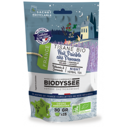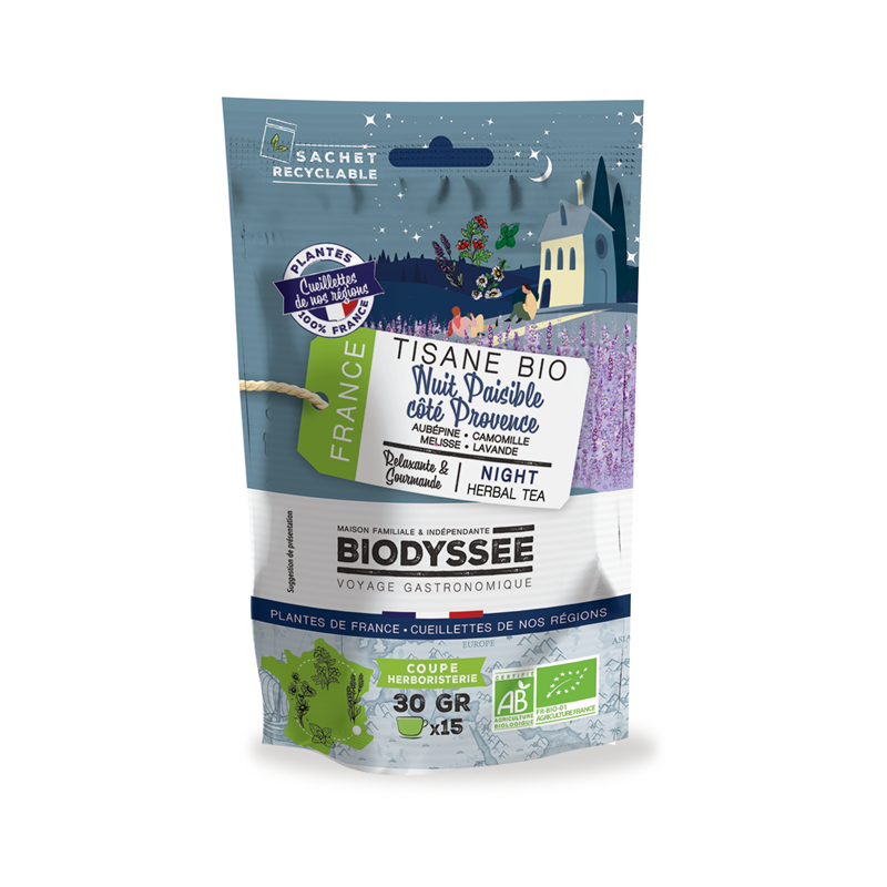 Notre tisane Nuit Paisible côté Provence est composée de plantes cueillies dans nos régions françaises. Elle associe les bienfaits de laubépine, de la camomille, de la mélisse et de la lavande pour faciliter lendormissement et réduire le stress tout en améliorant la qualité du sommeil. Elle offre une infusion gourmande et relaxante, à consommer de préférence le soir.