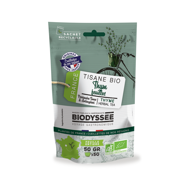 Notre thym est récolté dans les champs de Champagne, Normandie, Pays de la Loire et en Charente. Antiviral, antiseptique et antimicrobien, linfusion de thym est un remède naturel contre les rhumes, grippes ou autres maladies hivernales.