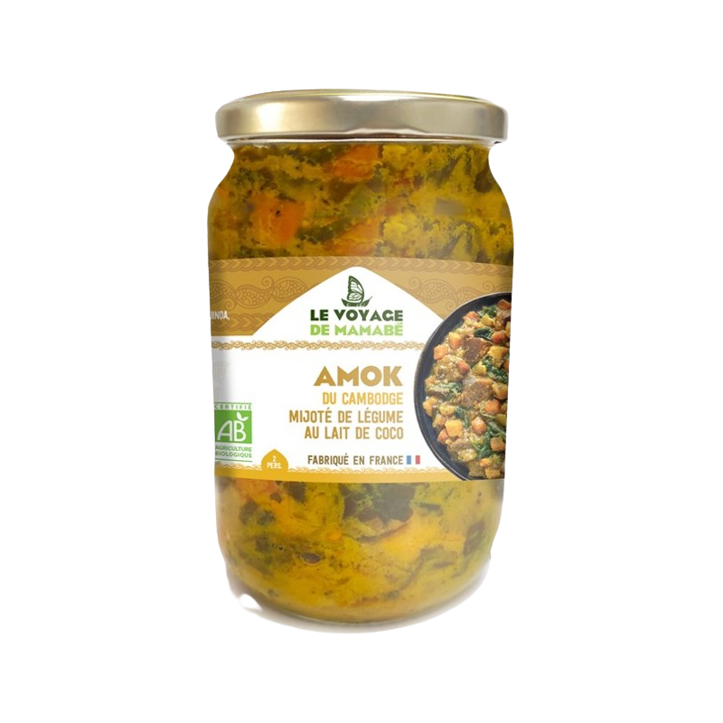 Légumes* (67%) (dont aubergine*, carotte*, patate douce*, chou-fleur*, épinard*, oignon*), lait de coco* (19%) (dont noix de coco*, eau), huile dolive*, épices et aromates*, tamari* (eau, fèves de soja* (37%), sel, alcool*, A.oryzae), huile de tournesol*, citronnelle*, gingembre*, vinaigre dalcool*, sel, combava*. *Produit issu de lagriculture biologique