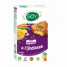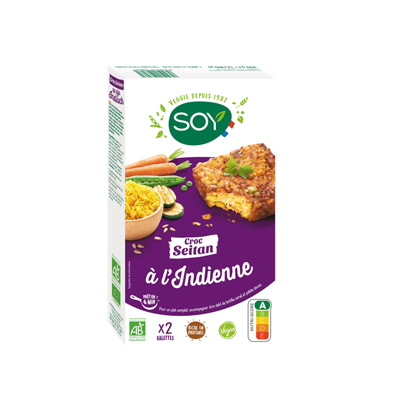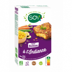 Seitan de blé* 39,7% (eau, gluten de blé*, farine de blé*, sel de mer), riz complet* cuit 20,1%, petits pois*, courgettes*, oignons*, carottes*, huiles végétales* (tournesol oléique* désodorisée, tournesol*), farine de pois chiches*, farine de blé*, graines de tournesol* grillées, flocons d'avoine complète*, sel de mer, curry*.(*) Ingrédients issus de l'Agriculture Biologique