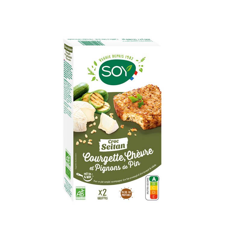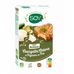 Seitan de blé* 38,9% (eau, gluten de blé*, farine de blé*, sel de mer), courgettes* 34,7%, riz complet* cuit, farine de blé*, oignons*, flocons d'avoine complète*, huile de tournesol oléique* désodorisée, fromage de chèvre* (sans présure animale) 2,3%, pignons de pin* 0,8%, sel de mer, graines de pavot*, concentré de tomates*, origan*.(*) Ingrédients issus de l'Agriculture Biologique