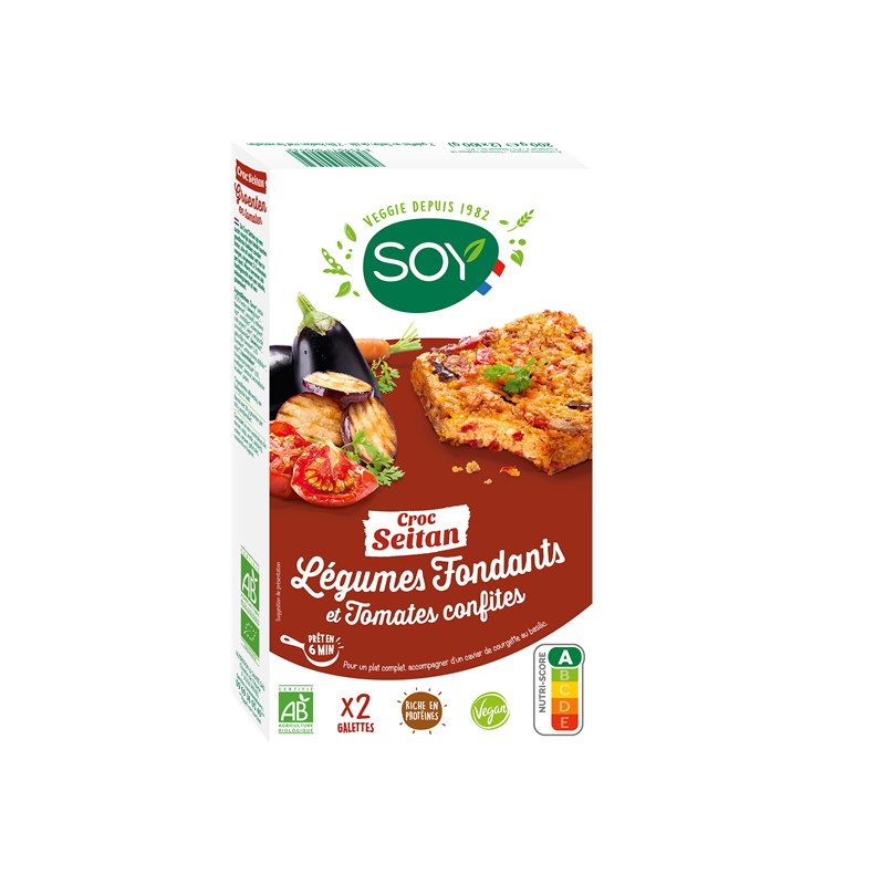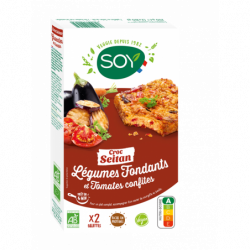 Seitan de blé* 39,5% (eau, gluten de blé*, farine de blé*, sel de mer), riz complet* cuit, carottes*, aubergines*, poivrons rouges*, oignons*, huile de tournesol oléique* désodorisée farine de blé*, tomates confites* 5,1% (tomates* séchées, huile d'olive vierge extra*), flocons d'avoine complète*, concentré de tomates* 1,5%, ail*, sel de mer, plantes aromatiques*, poivre*.(*) Ingrédients issus de l'Agriculture Biologique