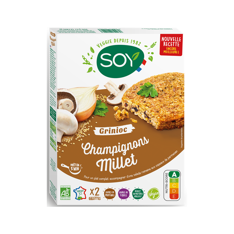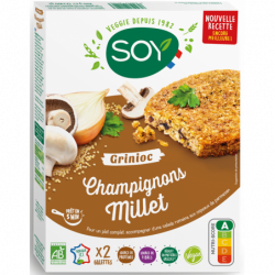Boulgour de blé complet* réhydraté 48,3%, champignons de Paris* 14,6%, millet* cuit 12,2%, oignons* 9,8%, farine de blé* 5,3%, huiles végétales* (huile de tournesol oléique* désodorisée, huile de tournesol*), flocons d'avoine complète*, flocons de blé complet* 2,4%, gluten de blé*, vinaigre de cidre*, ail*, sel de mer, persil*, champignons de Paris* déshydratés 0,88%, amidon de maïs*. (*) Ingrédients issus de l'Agriculture Biologique
