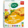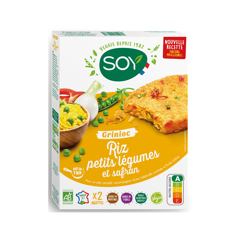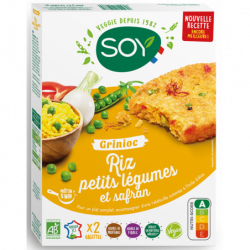 Riz complet* cuit 61%, petits pois* 10,5%, farine de riz* 7,3%, oignons* 6,8%, flocons de pois chiches*, poivrons rouges* 5,9%, huiles végétales* (huile de tournesol oléique* désodorisée, huile de tournesol*), farine de chanvre* concentrée, sel de mer, ail*, safran*. (*) Ingrédients issus de l'Agriculture Biologique