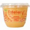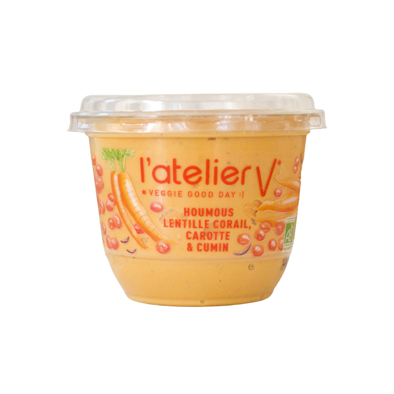 Lentille corail* 55 %, carotte* 13 %, huile de colza*, pâte de graines de sésame* décortiquées, jus de citrons* de Sicile, concentré (carotte* 1,1%, potimarron* et pomme*), sel de Guérande, ail*, cumin* 0,2 %, paprika*, poivre*, muscade*.