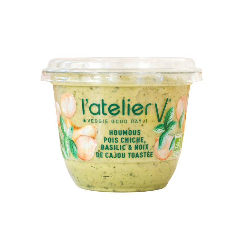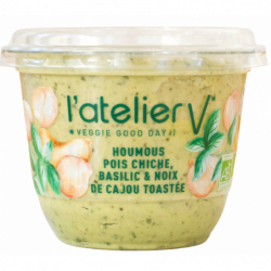 Pois chiche* (origine France) 42 %, crème de noix de coco*, huile de colza*, jus de citrons* de Sicile, basilic* 6,1 %, pâte de graines de sésame* décortiquées, noix de cajou** toastée 4,2 %, purée de noix de cajou* 1,5 %, sel de Guérande, ail*, poivre*.