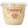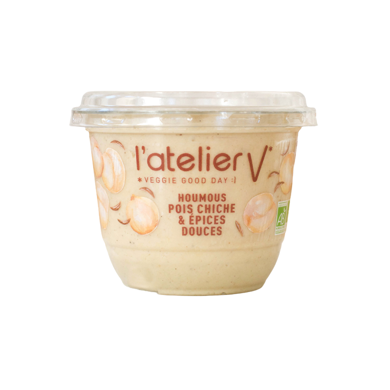 Pois chiche* (origine France) 61 %, huile de colza*, eau, jus de citrons* de Sicile, pâte de graines de sésame* décortiquées 3,7 %, sel de Guérande, ail*, cumin* 0,19 %, oignon*, poivre giroflé* (piment de la Jamaïque) 0,07%, poivre* 0,04 %, muscade* 0,04 %.