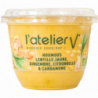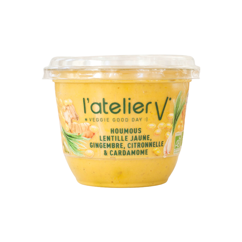 Lentille jaune* (origine France) 42 %, carotte*, huile de colza*, jus de citrons* de Sicile, pâte de graines de sésame* décortiquées, gingembre* 2,3 %, citronnelle* 2,3 %, sel de Guérande, citron* confit au sel (citron*, sel), huile vierge de tournesol*, vinaigre dalcool*, aneth* graine, coriandre* graine, cardamome* 0,14 %, poivre*, curcuma*.