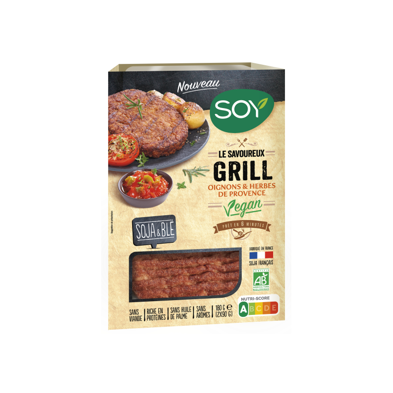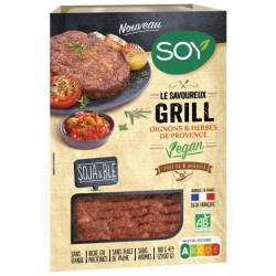 Eau, farine de soja(1)* déshuilée 19,9%, oignons* 13,3%, huile de tournesol oléique* désodorisée, flocons de blé complet* 8,5%, gluten de blé* 7,7%, concentré de tomates* 4,2%, farine de blé* 1,8%, vinaigre de cidre*, sel, herbes de Provence*, huile d'olive*, épaississants : farine de graines de caroube* et gomme xanthane, paprika*, coriandre*, cumin*, ail*, betteraves*, origan*.(*) Ingrédients issus de l'Agriculture Biologique