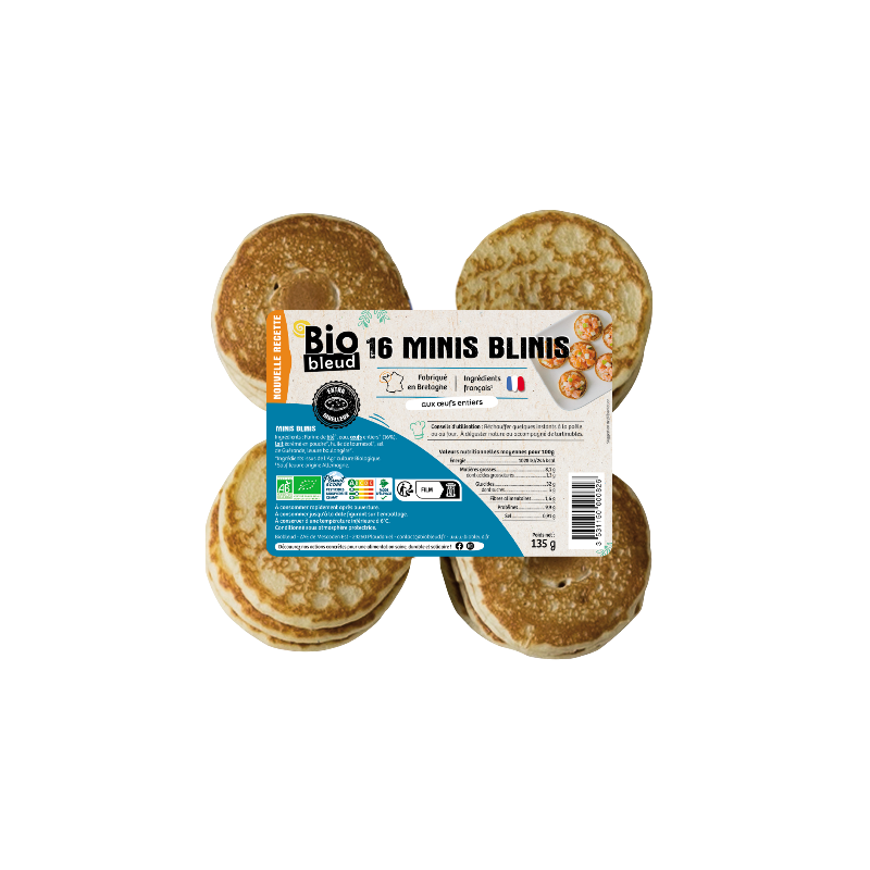 Farine de blé*, eau, ufs entiers*, lait écrémé en poudre*, huile de tournesol*, sel de Guérande, poudres à lever* (amidon de maïs*, carbonates de sodium, acidifiant : tartrates de potassium), levain de froment* déshydraté et dévitalisé.