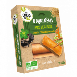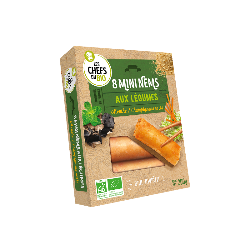 Galette* 51,3% (eau, farine de riz*, farine de blé*, huile de tournesol* désodorisée, sel de mer), oignons* 21,6%, carottes* 17,6%, choux* 9,6%, vermicelles de blé*, huiles végétales* désodorisées (tournesol oléique*,tournesol*), sauce de soja* (eau, soja*, blé*, sel de mer, ferment), menthe* douce 1,1%, champignons noirs* déshydratés 0,8%, ail*, sel de mer, gingembre* en poudre. (*) Ingrédients issus de l'Agriculture Biologique