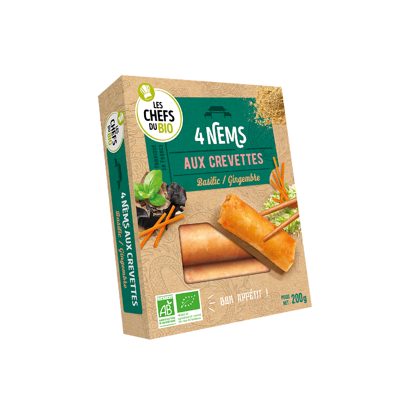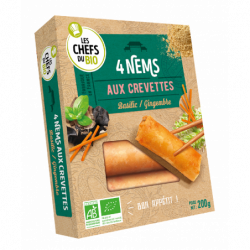 Galette* 44,3% (eau, farine de riz*, farine de blé*, huile de tournesol* désodorisée, sel de mer), oignons* 20,6%, carottes* 16,8%, crevettes* cuites 10,7%, choux* 9,2%, vermicelles de blé*, huiles végétales* désodorisées (tournesol oléique*, tournesol*), sauce de soja* (eau, soja*, blé*, sel de mer, ferment), basilic*, champignons noirs* déshydratés 0,8%, ail*, sel de mer, gingembre* en poudre.(*) Ingrédients issus de l'Agriculture Biologique