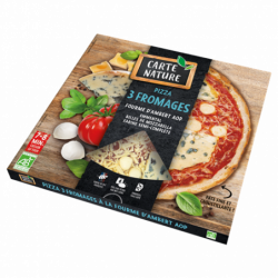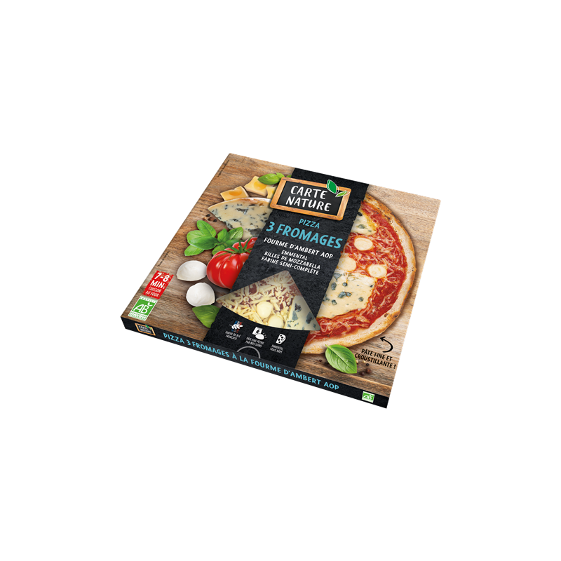 Garniture* 55% : Sauce tomate* cuisinée 27% (purée de tomate* 22%, oignons*, eau, huile de tournesol*, sel, persil*, basilic* 0,1%, ail* pulpe , poivre*, origan*, herbes* de Provence), EMMENTAL* 12 %, FOURME* D'AMBERT AOP 11%, MOZZARELLA* 4,9%.