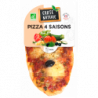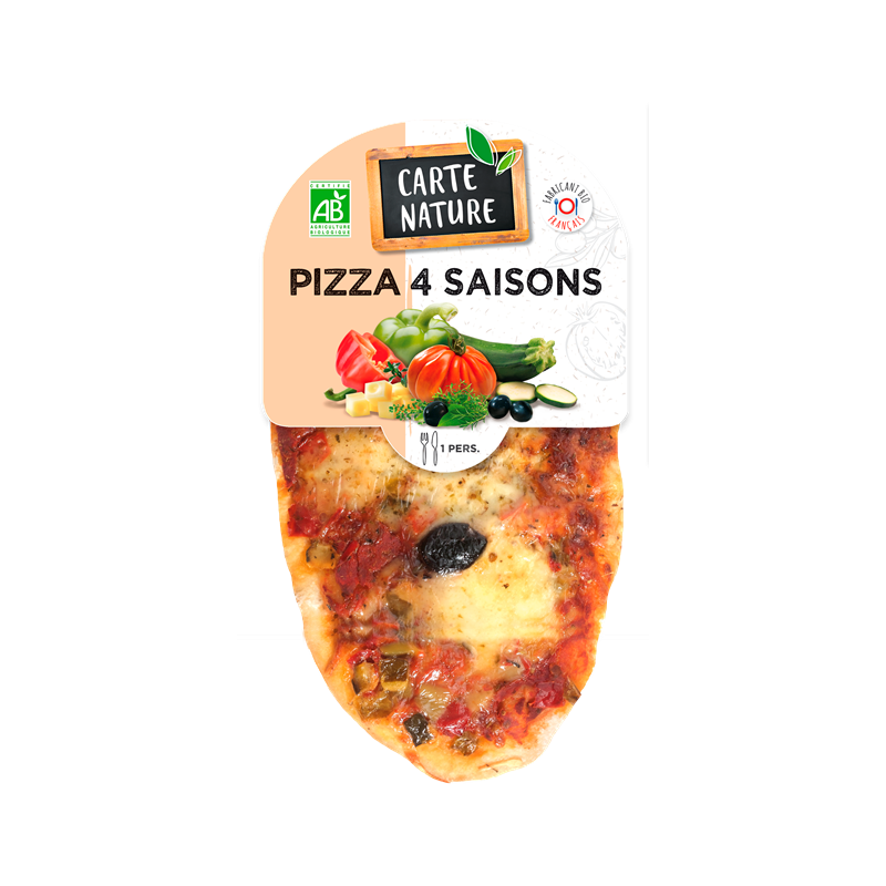 Garniture* 49% : sauce tomate* cuisinée 17% (purée de tomate* 12%, eau, oignons*, huile de tournesol*, sel, persil*, basilic*, ail*, poivre*, origan*, herbes* de Provence), emmental* 16%, courgettes* 8%, poivrons* 8%, olives noires* 1,3%, herbes* de Provence. (*) Ingrédients issus de l'Agriculture Biologique
