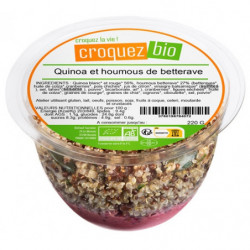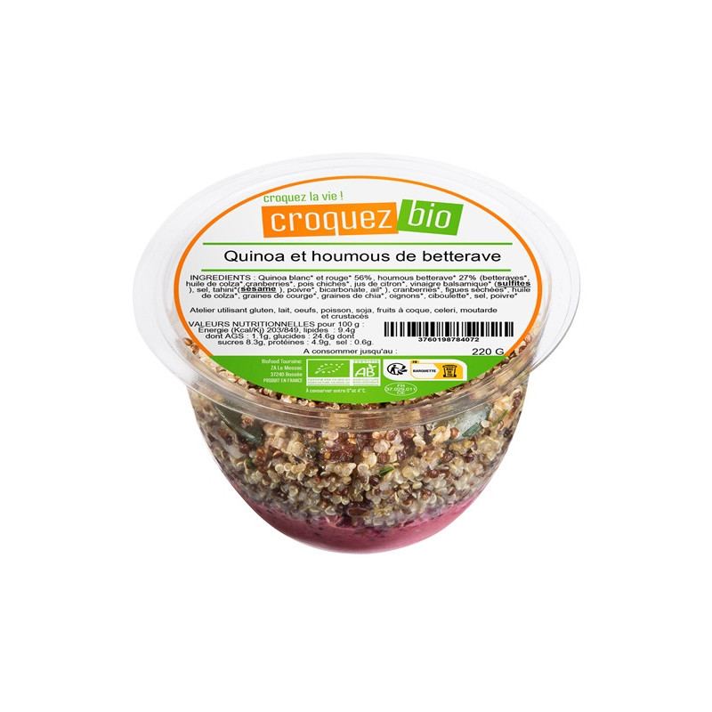 Duo de Quinoa Rouge* et Quinoa Blanc*, Houmous de Betteraves (Betterave*, Huile Colza*, Cranberrie*, Pois Chiches*, Jus de Citrons*, Vinaigre Balsamique*, Sel, Tahini* Sésame, Poivre*, Bicarbonate et Ail*), Cranberries*, Figues Séchées*, Huile de Colza*, Graines de Courge*, Graines de Chia*, Oignons Rouges*, Ciboulette*, Sel et Poivre*.