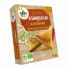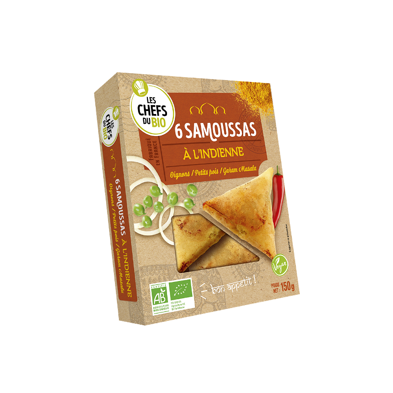 Galettes de blé* 62,9%(1) (farine de blé*, eau, sel de mer, huile de tournesol* désodorisée), pommes de terre* 32,4%(1), oignons* 14,2%(1), petits pois* 5,2%(1), huiles végétales* désodorisées (tournesol oléique*, tournesol*), épices* 1,2%(1) (dont garam masala* 0,14g(1)), sel de mer. (*) Ingrédients issus de l'Agriculture Biologique