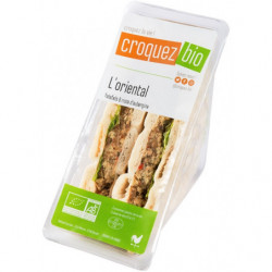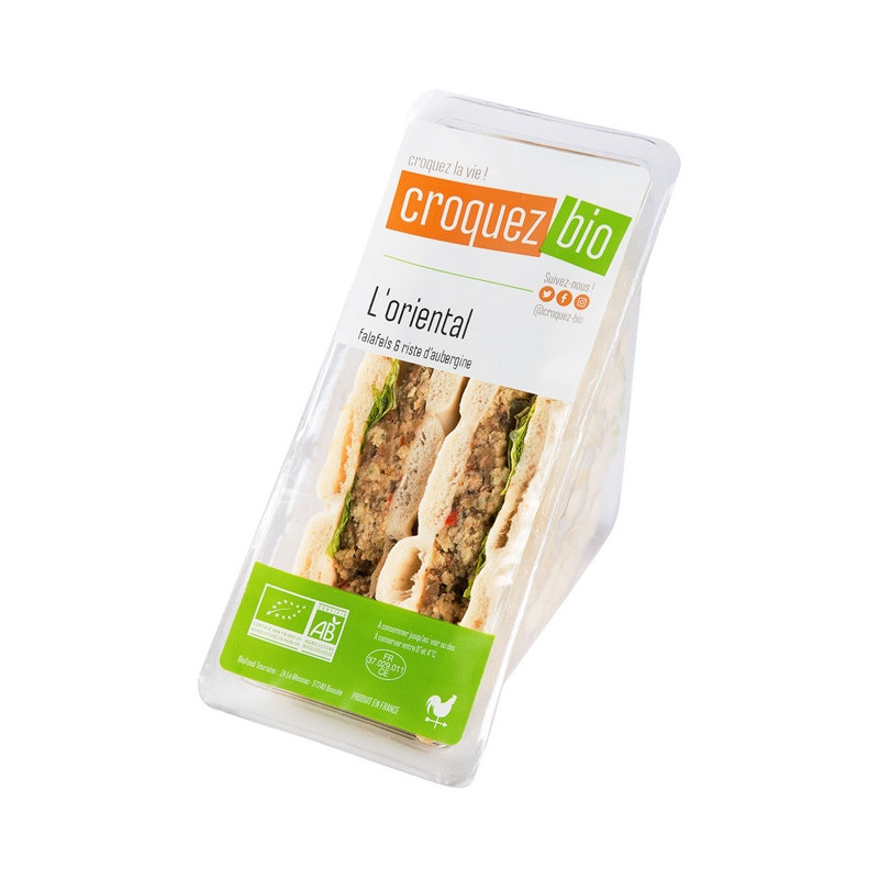 de la Farine : Acide Ascorbique), Riste d'Aubergine* (Aubergines* 52% , Eau et Poivrons Rouges*, Huile d'Olive*, Oignons*, Jus de Citrons*, Sucre Canne*, Sel, Ail*, Thym*), Falafels* (Pois Chiche*, Petit Pois*, Oignon*, Courgette*, Coriandre*, Persil*, Menthe*,