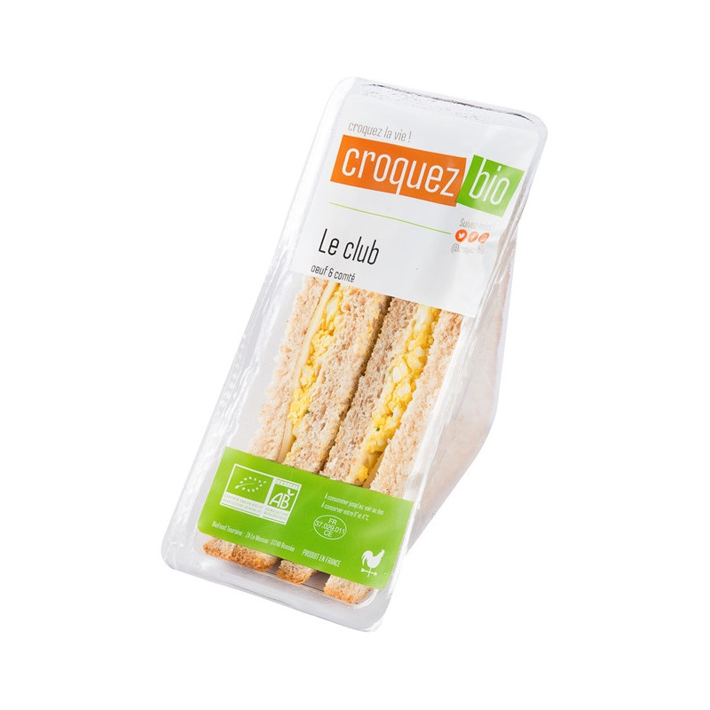 Pain de Mie* (Farine de Blé*, Eau, Farine Complète de Blé*, Sucre de Cannes Roux*, Levures, Huile de Colza*, Vinaigre de Cidre*, Son de Blé*, Sel, Gluten de Blé*, Agents de Traitement de la Farine : Acide), Oeuf*, Comté* (Lait de Vache*, Ferment Lactique, Sel et Présure), Mayonnaise* (Huile de Tournesol* Désodorisée, Jaunes d'Oeufs*, Eau, Moutarde de