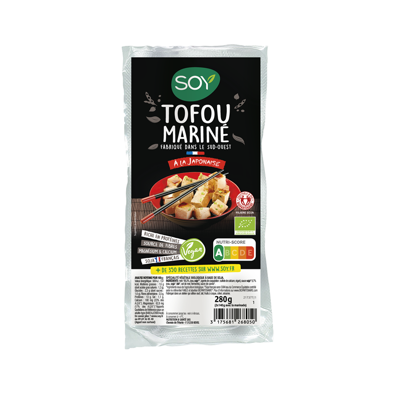 Tofu* 89,3% (eau, soja*(1,2), agents de coagulation : sulfate de calcium, nigari), sauce soja* 9,7% (eau, soja*(1), blé*, sel de mer, ferments), sucre de canne*. (*) Ingrédients issus de l'Agriculture Biologique