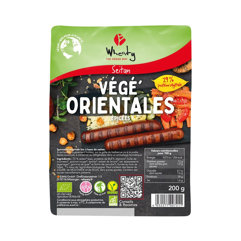 72% Seitan* (Eau et Protéines de Blé*), Oignons*, Huile de Tournesol*, Poivron Rouge*, Epice*, Extrait