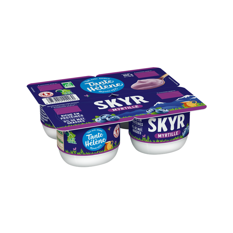 Lait écrémé pasteurisé*, myrtille* 9,6%, sucre de canne non raffiné*, 7,9%, amidon de tapioca*, arôme naturel de myrtille*, farine de graines de caroube*, ferments lactiques sélectionnés (lait).