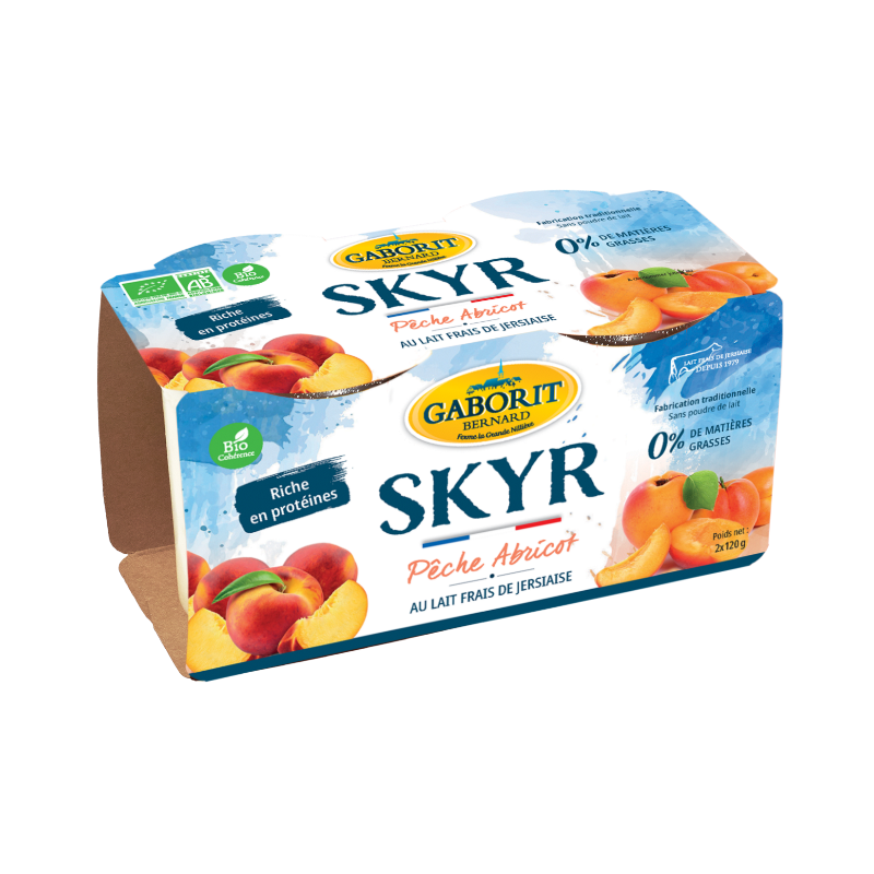 Le SKYR Pêche Abricot est lalternative gourmande et fruitée au SKYR nature, avec des ingrédients simples, naturels et des fruits bio français gorgés de soleil. Notre savoir-faire traditionnel et le lait frais de Jersiaises apportent plus de douceur et saveurs en bouche. Idéal en collation ou au petit-déjeuner. Une recette riche en protéines, sans matières grasses et sans sucre ajouté (uniquement le sucre présent dans la préparation de fruits).