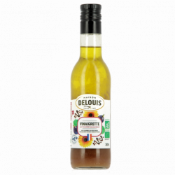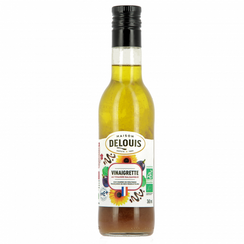 Huile dolive vierge extra* (25,5%), huile de tournesol* (24,5%), vinaigre balsamique* (19,5%) (vinaigre de vin*, moût de raisin*), eau, vinaigre de vin rouge*, moutarde de Dijon* (graines de moutarde*, vinaigre dalcool*, eau, sel), sel. *Issus de lagriculture biologique
